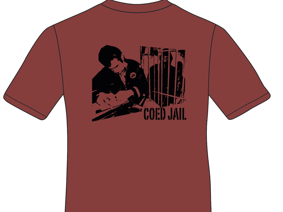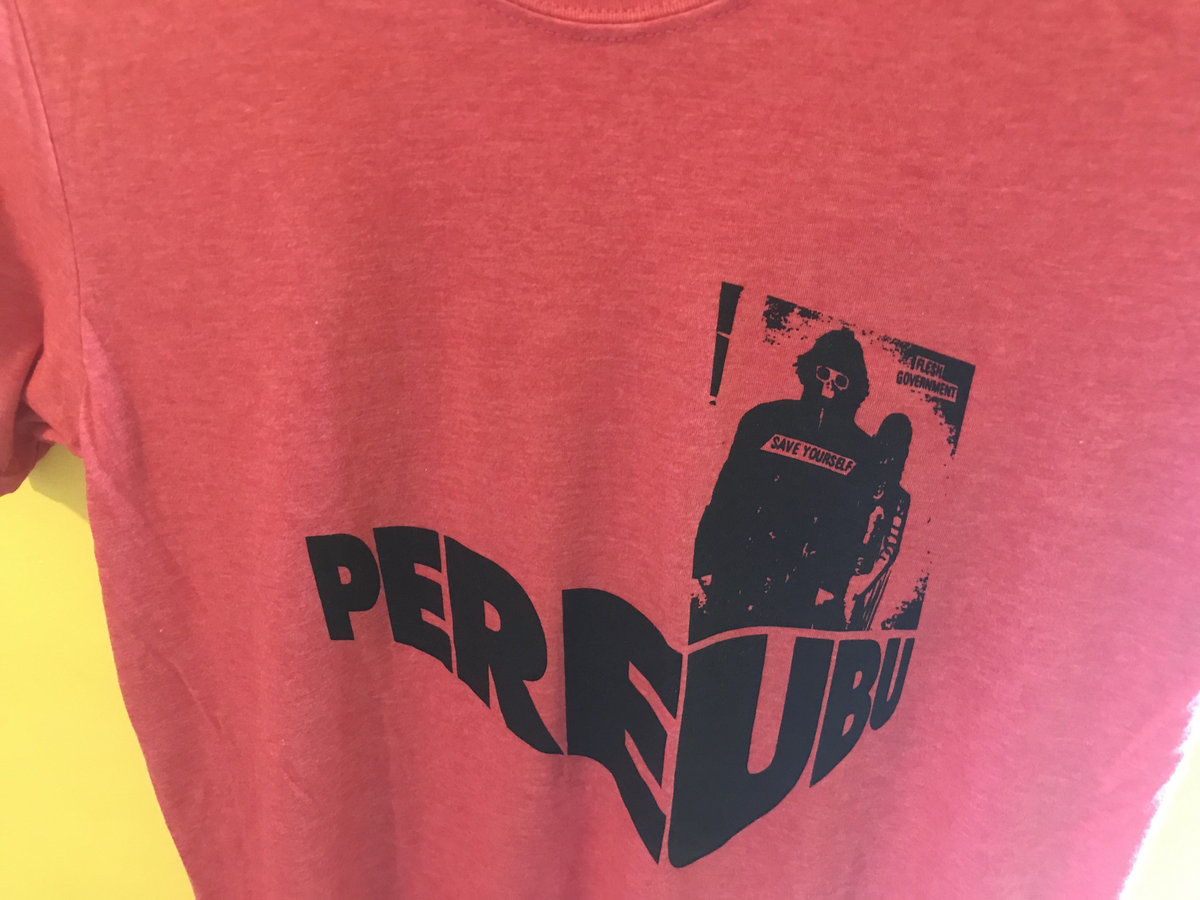 Pere Ubu/Coed Jail T using original art from the 1978 Coed Jail Tours across USA and Europe (back of T) and incorporated into a logo for Pere Ubu (front of T). All artwork by Johnny Dromette.