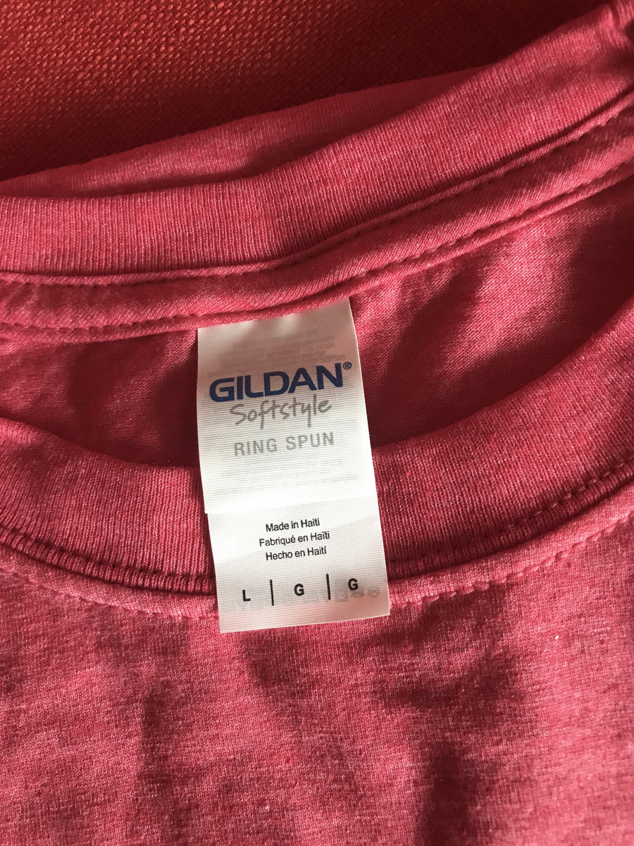 T-shirt is Gildan Softstyle Ringspun, black print on 'Heather Red'. Sent from both USA& UK. Canada order from UK for best shipping prices.